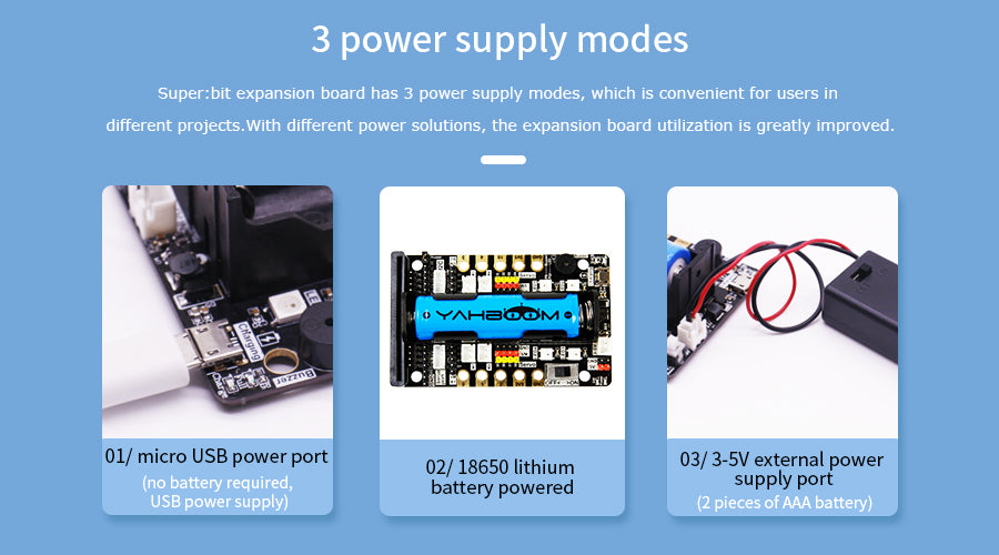 - Three power supply method: micro USB power supply, 18650 lithium battery power supply, 3-5v external battery box power supply.