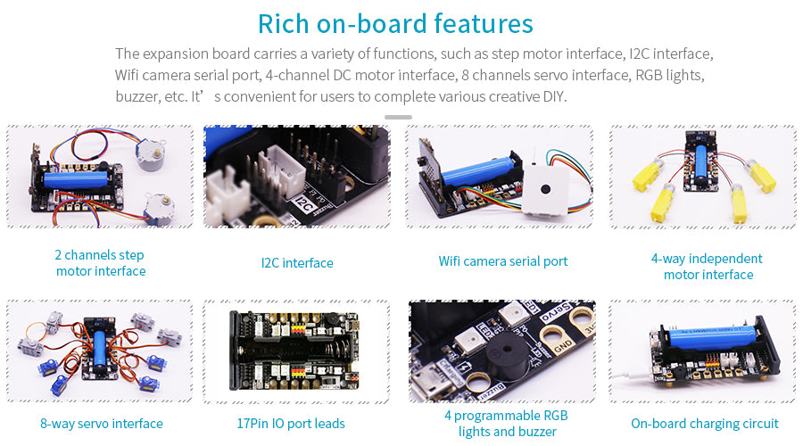 - Power ability to drive DC motors, stepper motors, servos, onboard buzzer and programmable RGB lights.
